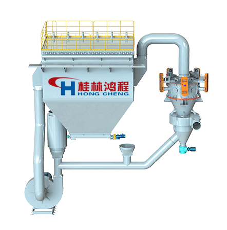 物料通過給料機定量進入進料管道,與系統(tǒng)進風(fēng)混合均勻后,由下端入料口進入分級機,符合粒徑要求的細(xì)顆粒隨氣流進入旋風(fēng)收集器,經(jīng)收集細(xì)粉后的氣流再次回到分級機,形成閉路,循環(huán)的氣流一部分進入余風(fēng)脈沖,經(jīng)除塵后排出,粗顆粒夾帶部分細(xì)顆粒沿筒壁下降至二次風(fēng)處,經(jīng)二次風(fēng)的淘洗作用,使粗細(xì)顆粒分離,細(xì)顆粒上升至分級區(qū)進行二次分級,粗顆粒下降至下料口排出。